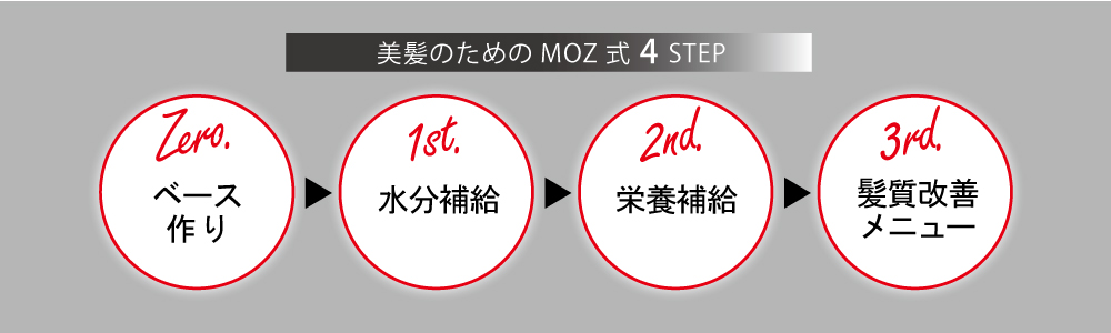 何がZERO/ゼロかについて説明させていただきます。MOZではヘアケアをタイプ別「ゼロ/ファースト/セカンド/サード」に4種に分けています。4種それぞれに違う働きを持ち、髪をキレイにするために必要な工程となり、この4ステップで結果が大きく変わってくるメソッドとなります。MOZでは、この4ステップで行う「ベース作り」が ヘアケアのすべてにおいて最重要項目と考えており、そのまま名称としました。